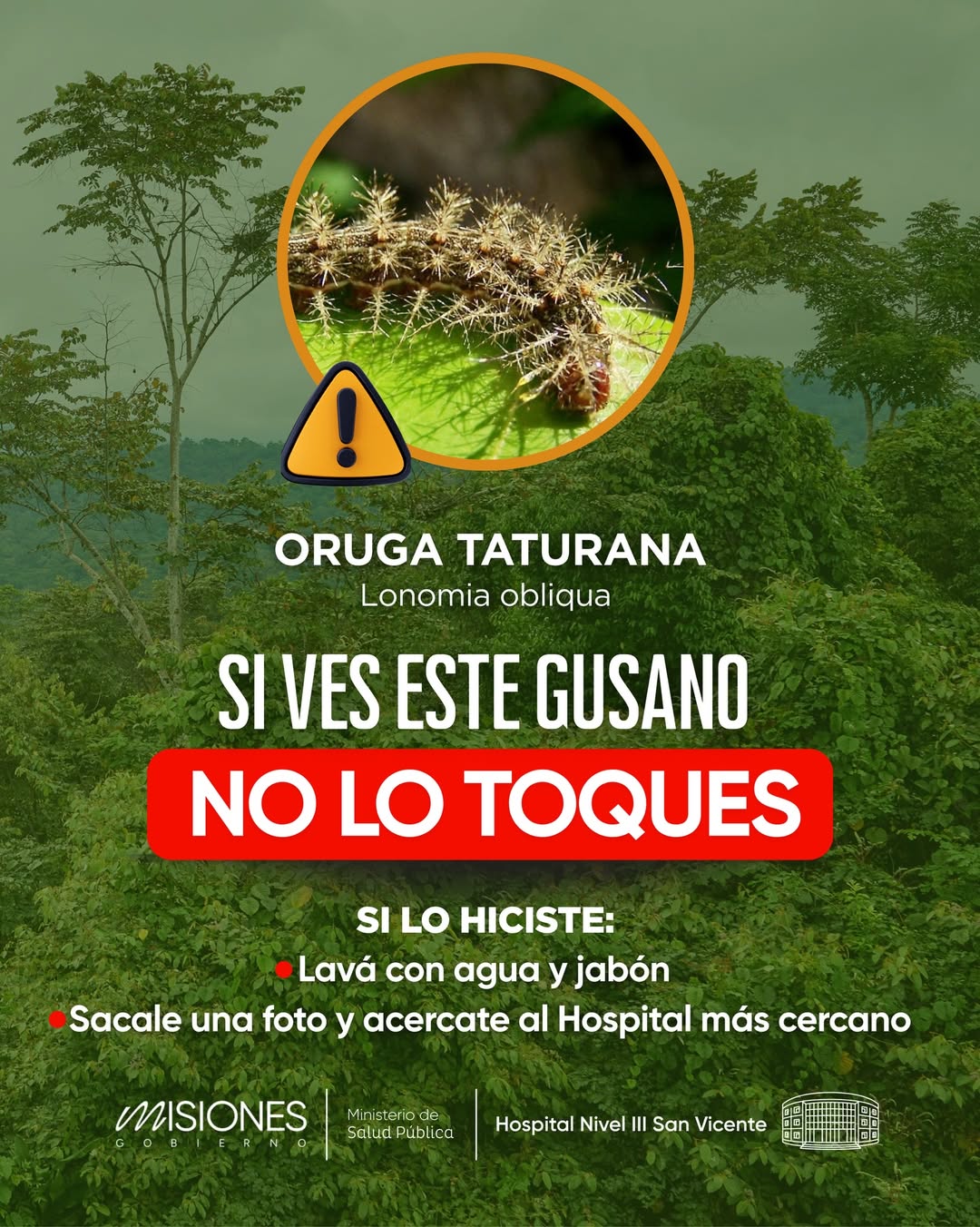 En las últimas horas, autoridades sanitarias advirtieron sobre la posible presencia en la región de la oruga taturana (Lonomia obliqua), un insecto considerado altamente peligroso para la salud humana debido a la toxicidad de sus pelos urticantes. El contacto accidental puede provocar hemorragias internas y externas de gravedad, por lo que se solicita extremar las precauciones, especialmente en zonas rurales, montes y espacios verdes.