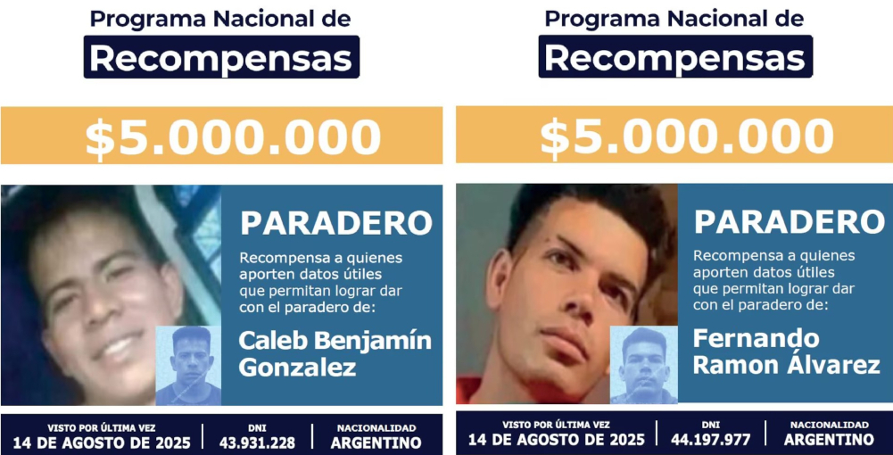 El Ministerio de Seguridad Nacional dispuso el ofrecimiento de una recompensa de cinco millones de pesos por Fernando Ramón Álvarez y Caleb Benjamín González, quienes fueron vistos por última vez el 14 de agosto en las inmediaciones del río Paraná, en Santa Fe.