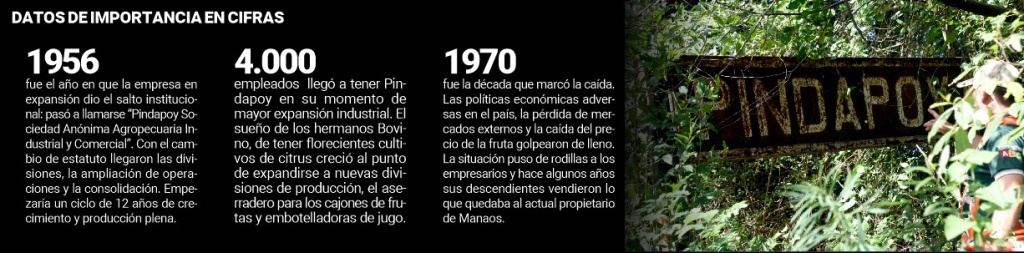“Mientras otras firmas acopiaban fruta de menor calidad, los Bovino apostaron por estándares más altos. Viajaron a Estados Unidos, incorporaron conocimientos, variedades nuevas, técnicas modernas. Pomelos, naranjas, mandarinas, limones: los cítricos comenzaron a cubrir toda la zona”, señaló don Blas. En 1956 la empresa dio un salto institucional: pasó a llamarse “Pindapoy Sociedad Anónima Agropecuaria Industrial y Comercial”. Con el cambio de estatuto llegaron las divisiones, la expansión y la consolidación.