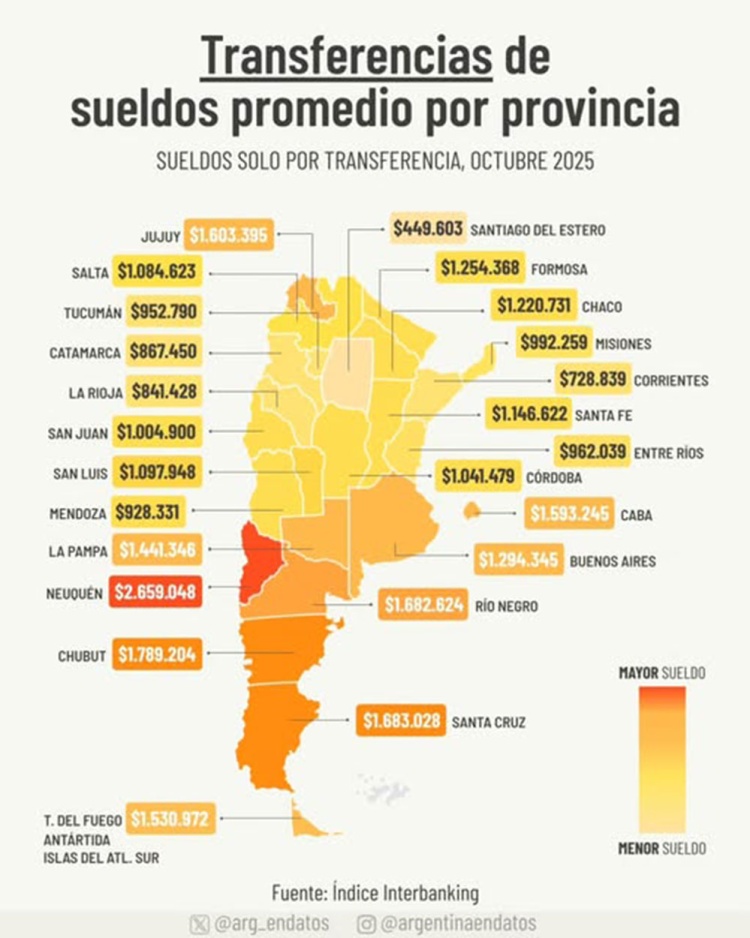 Las transferencias de sueldos promedio por provincia en Argentina exhiben una brecha cada vez más marcada entre regiones. Según datos del Índice Interbanking, correspondientes a octubre de 2025, los salarios acreditados por transferencia oscilan entre poco más de $449 mil y casi $2,7 millones mensuales, reflejando un mapa salarial profundamente desigual.