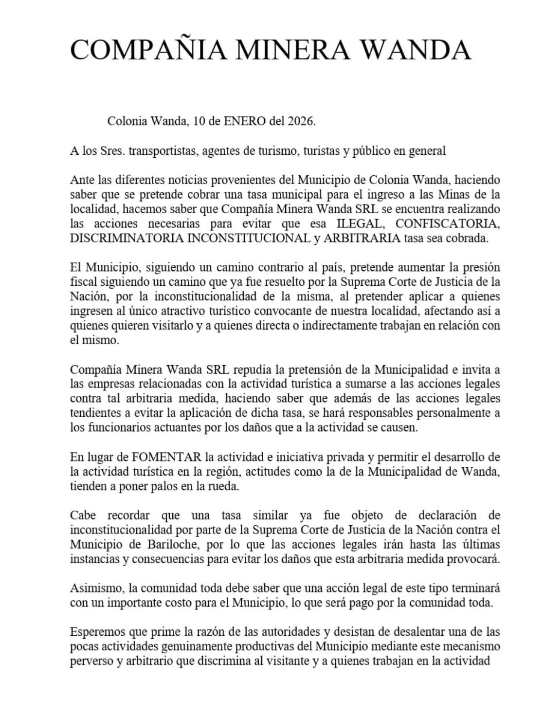 Desde la Compañía Minera Wanda advirtieron que el Municipio “elige aumentar la presión fiscal en un contexto adverso”, en lugar de fomentar la iniciativa privada y el desarrollo turístico. Además, invitaron a otras empresas del sector a sumarse.