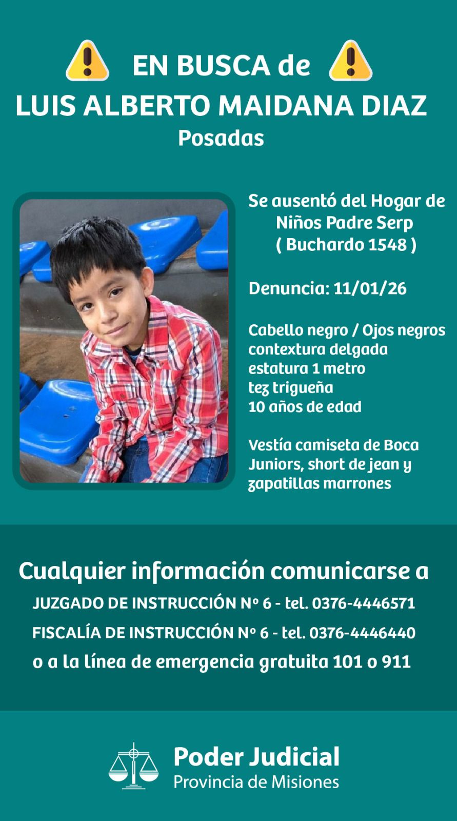 Luis Alberto Maidana Díaz fue visto por última vez con una camiseta de Boca Juniors, short de jean y zapatilla marrones claras. Es de tez morena, delgado y mide 1 metro de alto.
