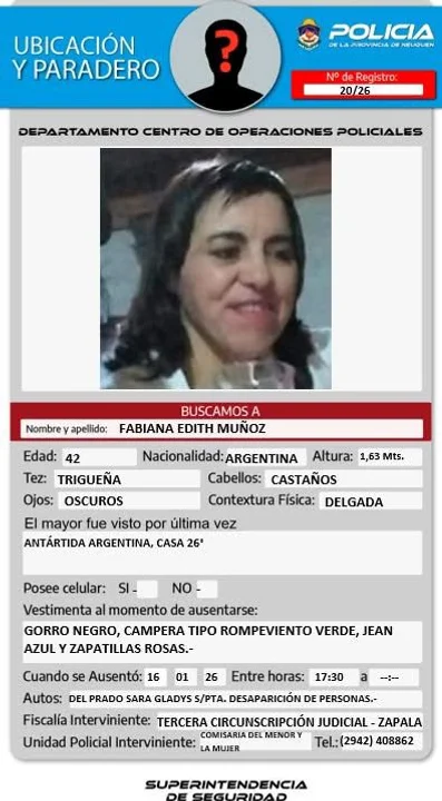La Policía de Neuquén emitió un pedido de paradero con los datos clave del caso y precisó que Fabiana fue vista por última vez en su domicilio de calle Antártida Argentina, casa 26, en Zapala. De acuerdo a la descripción oficial, es de tez trigueña, cabellos castaños, ojos oscuros y contextura delgada.