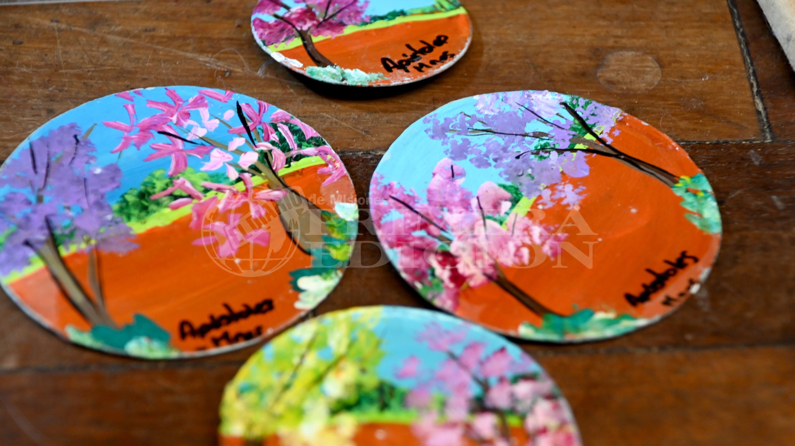 “Yo había comenzado por hacer los mates tallados y pintados; esa era la idea principal hasta que noté la enorme cantidad de restos de porongos o de las tapitas de metal que iban quedando en la basura, entonces decidí seguir pintando esas piezas hasta hacer algo nuevo, por ejemplo, este resto de porongo”, dijo mientras tomó una bella artesanía entre las manos, “se transformó en un porta sahumerio, pintado con toda la referencia de los saltos de las cataratas, lapachos y yerba”, prosiguió orgullosa.