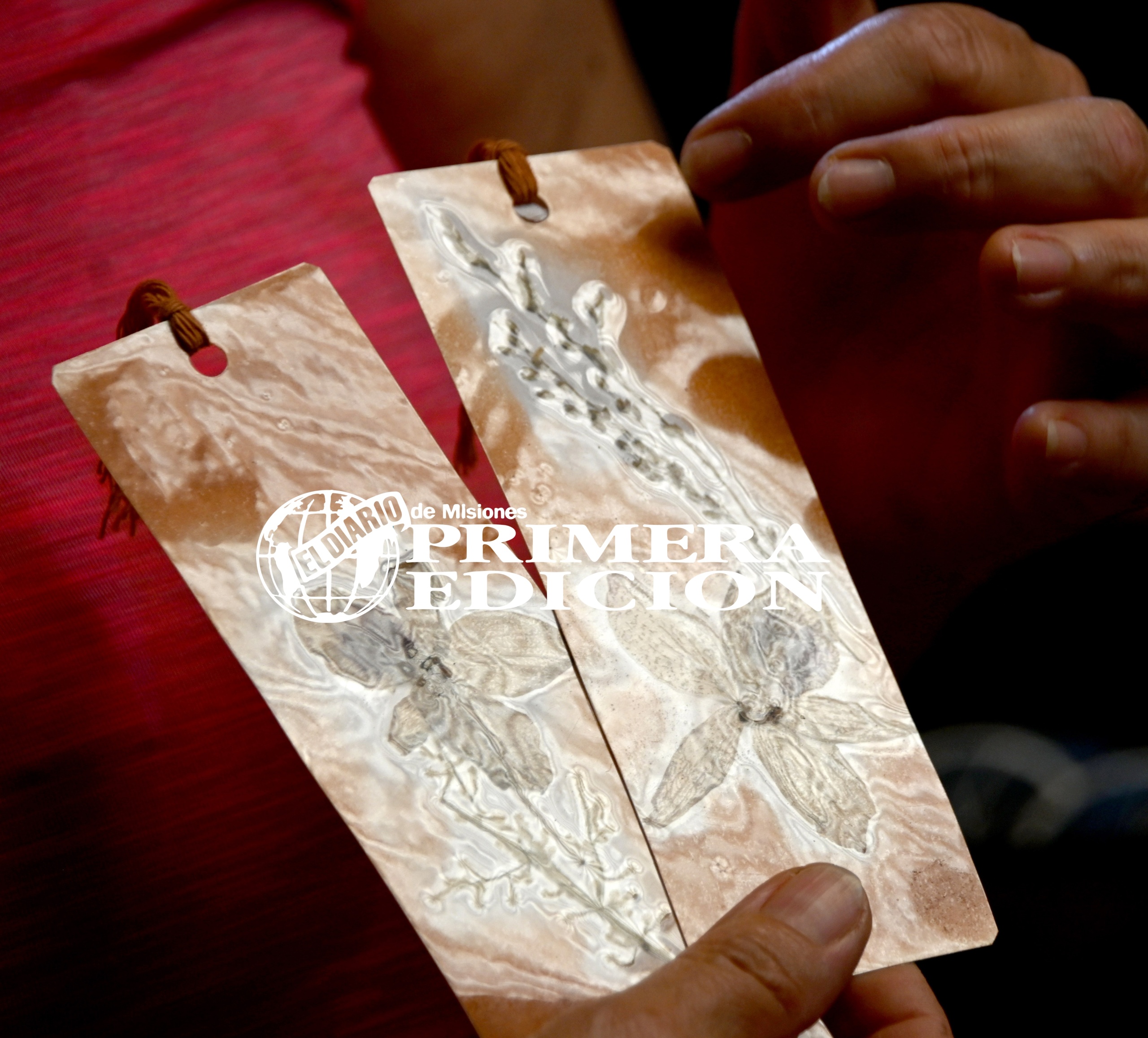 Inclusive mostró un señalador para los libros creado íntegramente con papel reciclado, flores secas de los jacarandás, todo pintando bellamente con tinte hecho con suelo misionero.