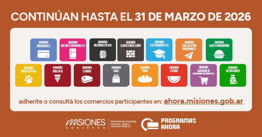 El Gobierno de la Provincia de Misiones prorrogó la vigencia de todos los Programas Ahora hasta el 31 de marzo de 2026, con el objetivo de fortalecer la competitividad del comercio local y potenciar la capacidad de consumo de los hogares misioneros, según anunció el gobernador Hugo Passalacqua.