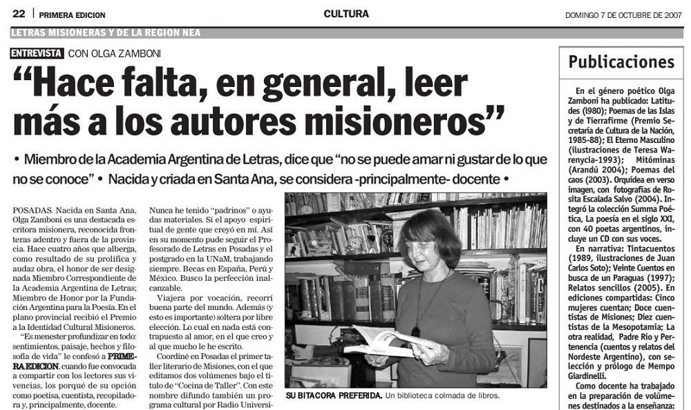 Maestra, profesora, escritora y poetisa, madrina de numerosos autores misioneros y coronada por muchos de ellos como su referente, Olga Zamboni se despedía de este mundo el 26 de enero de 2016, dejando tras de sí un legado de talento, generosidad y compromiso con nuestra cultura.