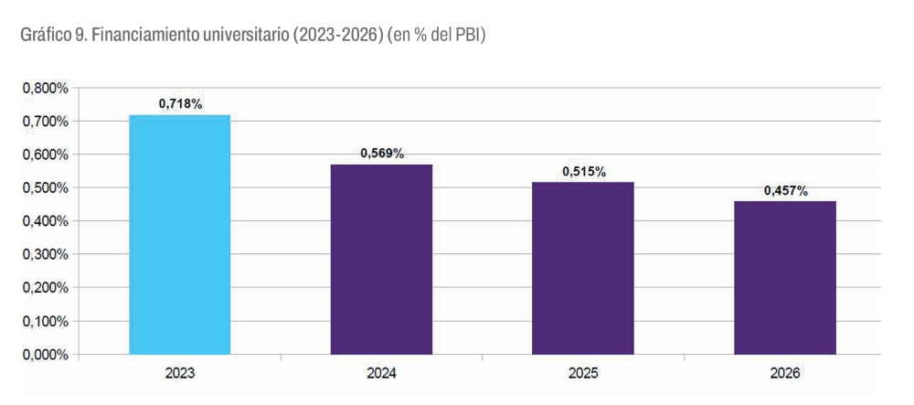 En paralelo, el presupuesto universitario no muestra señales de recuperación. Tras un desplome del 21,8% en 2024, la inversión en universidades nacionales volvió a descender un 5,4% en 2025 y el Presupuesto 2026 proyecta una nueva baja del 6,8%. Así, el peso del financiamiento universitario en el PBI caerá al 0,457%, muy lejos del 0,718% que representaba en 2023.