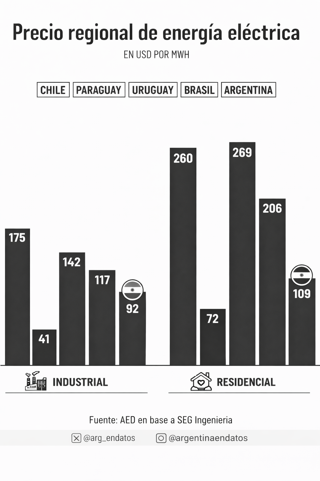En el uso industrial, Argentina presenta un valor cercano a los 92 US$/MWh, claramente por debajo de Brasil (117 US$/MWh), Uruguay (142 US$/MWh) y Chile (175 US$/MWh).