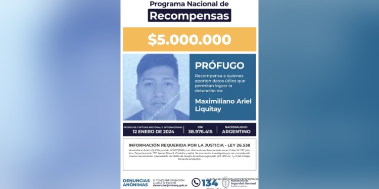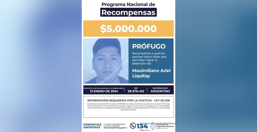 El Gobierno y el Ministerio de Seguridad Nacional ofrecen una recompensa de 5 millones de pesos para lograr la detención de Maximiliano Ariel Liquitay, un hombre que desde hace dos años posee un pedido de captura nacional e internacional por el delito de lavado de activos.