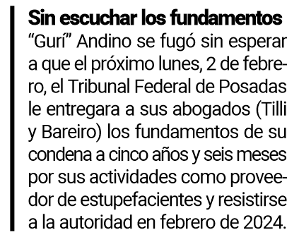 De todas maneras, fuentes consultadas por PRIMERA EDICIÓN, resaltaron que continúa firme la sospecha que “Gurí” Andino no haya logrado salir de la zona sur posadeña. Para ello se solicitaron intervenciones telefónicas que los pesquisas de la Policía provincial sostienen como clave para ubicar al joven condenado, el pasado 23 de diciembre, a cinco años y seis meses de prisión por tenencia de poco más de un kilogramo de clorhidrato de cocaína fraccionada para comercializar y resistirse a un procedimiento de investigadores policiales en febrero de 2024 en el barrio Sur Argentino de Posadas, donde residía con su familia.