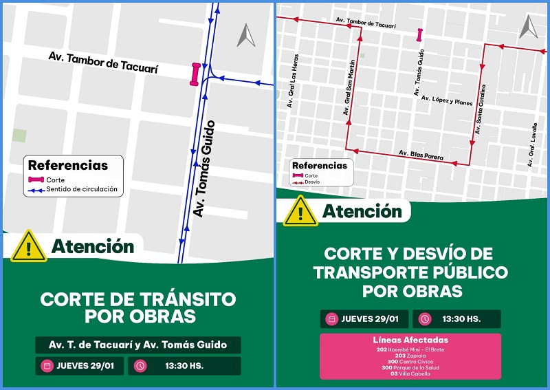 La Municipalidad de Posadas informó que este jueves 29 de enero, a partir de las 13:30, se llevará a cabo un corte de tránsito en la intersección de las avenidas Tambor de Tacuarí y Tomás Guido, debido a la realización de obras en la zona.