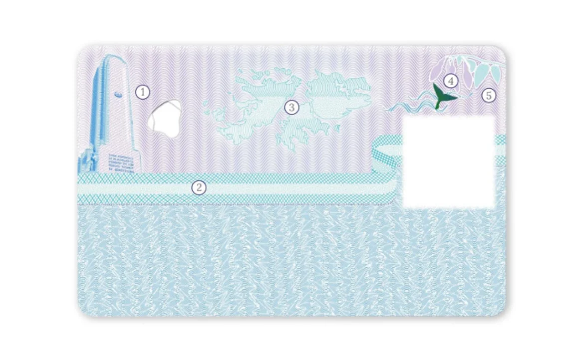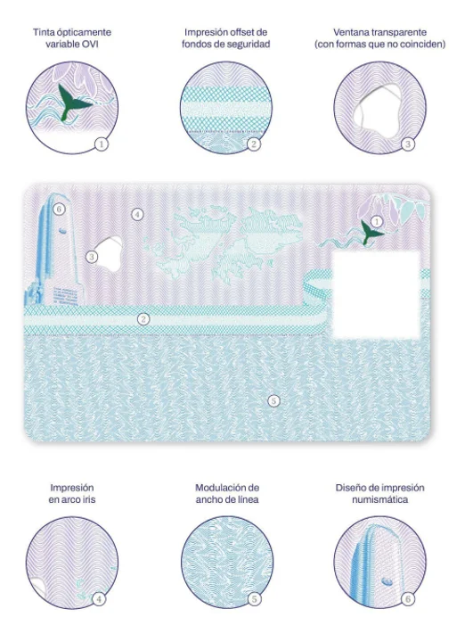El fondo de la página tiene guilloches perdidos y espejados, impresos a DOS (2) colores, una representación estilizada del globo terráqueo con tramas que diferencian la silueta de la República Argentina, el símbolo internacional de documentos de viaje, una imagen MIRAGE y una ventana transparente
