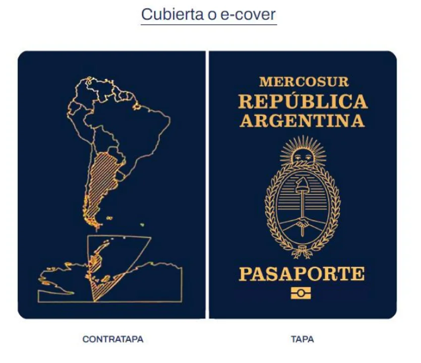 En el sector central, aparecen impresas las leyendas “MERCOSUR” y “REPÚBLICA ARGENTINA”, el Escudo Nacional, y por debajo de estos, la leyenda “PASAPORTE” y el símbolo internacional de pasaporte electrónico.
