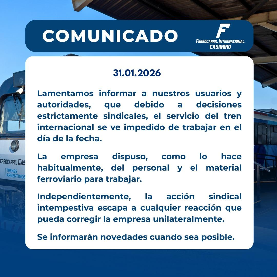 El servicio del tren internacional quedó suspendido este sábado como consecuencia de una medida sindical que impidió su normal funcionamiento. La situación fue confirmada a través de un comunicado oficial difundido por la empresa Ferrocaril Internacional Casimiro, en el que se informó que la interrupción de las operaciones responde a “decisiones estrictamente sindicales”.