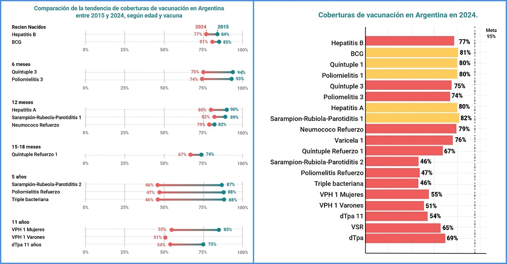 El 4° Informe Especial del Observatorio de la Infancia y Adolescencia de la SAP, que midió los cambios en la tasa de vacunación desde 2015 hasta 2024, advierte que ninguna de las vacunas del calendario nacional alcanza hoy la meta de cobertura del 95% y algunas dosis registran descensos de más de 40 puntos porcentuales en la última década.