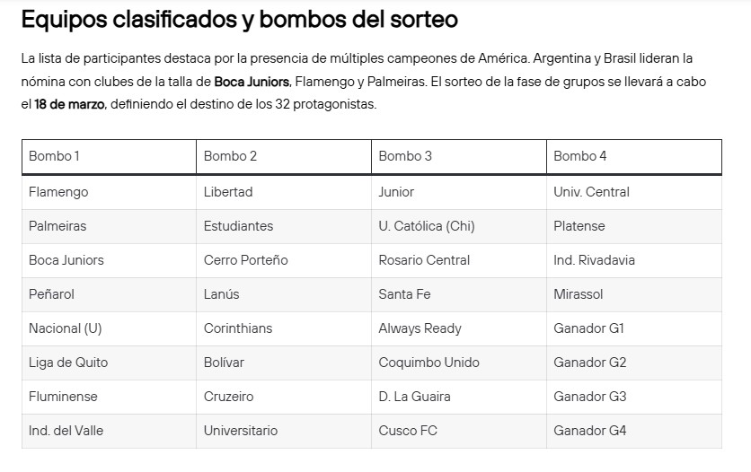 Ya en la fase de grupos de la Libertadores participarán 32 clubes, de 10 países sudamericanos: Argentina, Bolivia, Brasil, Chile, Colombia, Ecuador, Paraguay, Perú, Uruguay y Venezuela. Y estarán presentes los clubes que se consagraron campeones este año de la Libertadores, como Flamengo, y de la Sudamericana, que fue Lanús, y cuatro equipos que superen la fase previa.