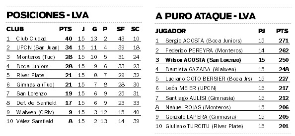 Ese triunfo le permitió a San Lorenzo cerrar con una sonrisa el Tour 5 de la LVA, que se jugó durante el finde en Comodoro Rivadavia. Previamente, el sábado, el Cuervo había caído ajustadamente ante Monteros de Tucumán, por 3-2, con otra notable producción de Acosta, que marcó 25 puntos y fue nuevamente el goleador de su equipo. El viernes, el Santo tampoco había podido ganar: cayó 3-0 ante Vélez Sarsfield con 11 unidades de Wilson.
