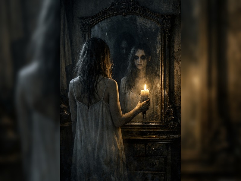 No era un juego popular. Se hablaba de él en voz baja, casi como una advertencia. La tradición indicaba que, exactamente a medianoche, alguien debía quedarse solo en una habitación completamente oscura, frente a un espejo antiguo, iluminado únicamente por una vela. El resto debía esperar afuera sin intervenir, sin golpear, sin llamar.