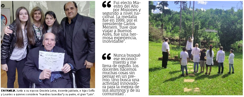 La distancia que separa su casa de la escuela ronda los 25 kilómetros y en más de 30 años de servicio se ingenió para trasladarse de distintas maneras. Al principio, iba en colectivo por una ruta que era de tierra y presentaba sus dificultades. “Después, con otros colegas, íbamos a dedo y entrábamos caminando a la picada. Luego, conseguimos una motocicleta y, cuando formé mi familia con Graciela Leiva -también docente- fuimos progresando y compramos un vehículo, con el que viajo todos los días para llegar a la escuela”, manifestó.
