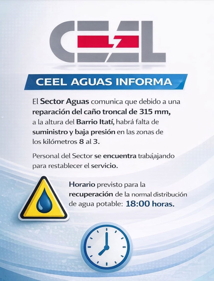 Desde CEEL Aguas solicitaron a la población hacer un uso responsable del recurso una vez que el servicio comience a normalizarse, para facilitar la recuperación total del sistema y evitar nuevos desequilibrios en la presión.
