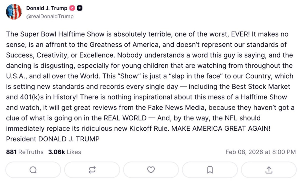 “El show de medio tiempo es absolutamente terrible, uno de los peores de la historia. No tiene sentido, es una afrenta a la grandeza de América y no representa nuestros estándares de éxito, creatividad o excelencia”, escribió el mandatario.