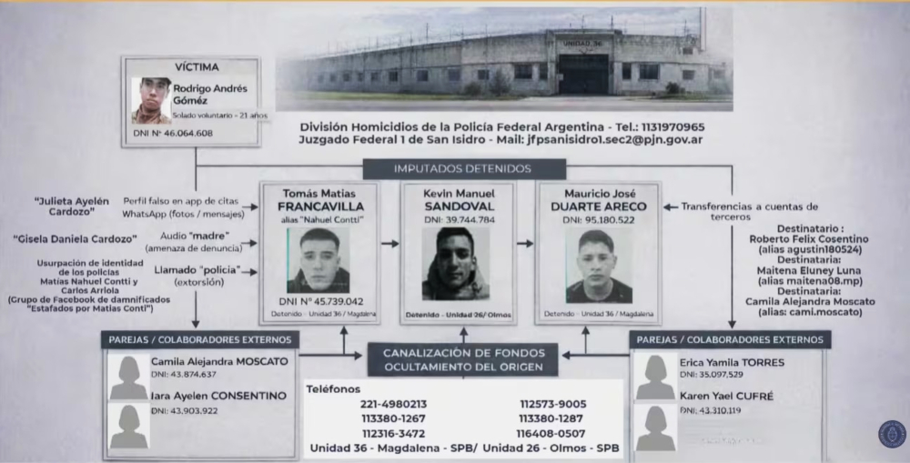 La conferencia conjunta del Gobierno y la Justicia expuso, de ese modo, una organización que operaba desde cárceles bonaerenses mediante estafas digitales, usurpación de identidad y extorsión sistemática. La investigación vinculó directamente ese accionar con la muerte del soldado Rodrigo Gómez, quien se encontraba sometido a presiones económicas y psicológicas derivadas de esas maniobras.