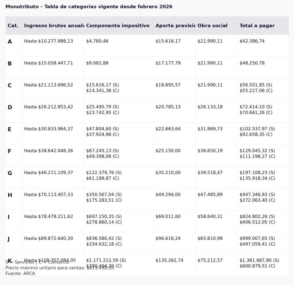 La Agencia de Recaudación y Control Aduanero (ARCA) actualizó a mediados de enero la tabla del monotributo, aplicando un incremento del 14,29% en todos los valores del régimen. El ajuste responde a la inflación acumulada entre julio y diciembre de 2025 y comenzó a regir este mes, impactando tanto en los montos a pagar como en los límites de facturación.