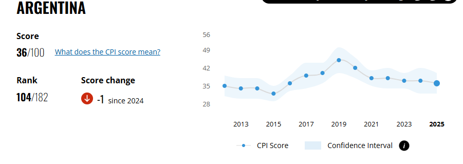 Se trata del Índice de Percepción de la Corrupción (IPC) que elabora todos los años el movimiento global Transparencia Internacional, en el cual nuestro país obtuvo una calificación de 36 puntos sobre 100 teniendo en cuenta el 2025. Es un punto menor a la puntuación obtenida en 2024, por lo cual Argentina se percibiría como un país más corrupto.