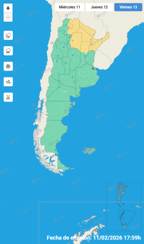 El Servicio Meteorológico Nacional (SMN) emitió una alerta amarilla por lluvias y tormentas para toda la provincia de Misiones que regirá el próximo viernes 13 de febrero. El organismo advirtió que se esperan fenómenos meteorológicos que podrían generar inconvenientes temporales en actividades cotidianas, aunque no se prevén eventos extremos.