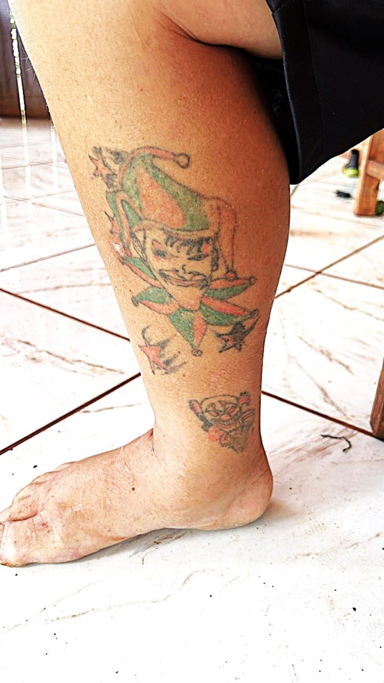“RESPETO”. El tatuaje tumbero de un payaso en la pierna derecha, galardón del PCC para quienes mataron a un policía.