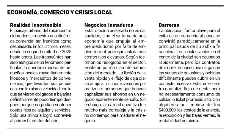 Durante los últimos meses de 2025 y el primer bimestre del año en curso se consolidó en Eldorado una tendencia denominada informalmente como el “boom de los comercios pasillos”, donde grandes superficies son subdivididas en unidades de escasos metros cuadrados para reducir costos operativos y garantizar la actividad comercial y la ocupación.