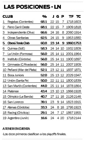 Más allá de la racha negativa, OTC ostenta 14 triunfos y 9 derrotas, por lo que se mantiene en la quinta posición y a la expectativa de seguir subiendo. Obras, que viene de caer ante Gimnasia en Comodoro Rivadavia (88-86), marcha cuarto y pelea en el “mano a mano” con los obereños.