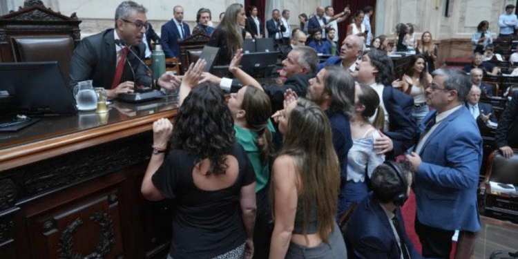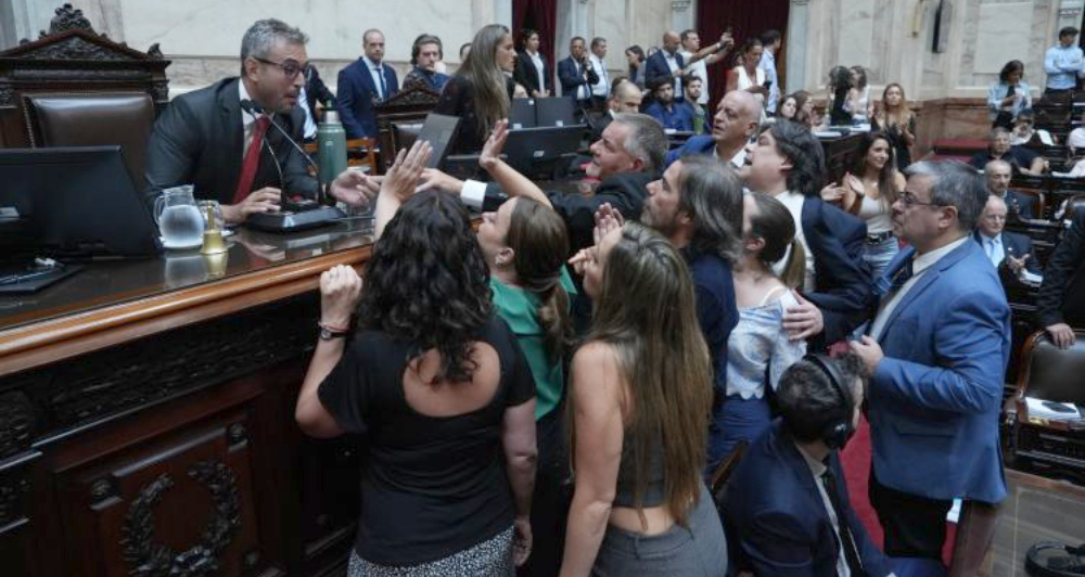La votación del plan de labor a mano alzada fue el punto de quiebre. Unión por la Patria reclamó que fuera nominal, argumentando que se trataba de una definición clave para la transparencia del procedimiento. El presidente de la Cámara, Martín Menem, dio por válida la aprobación y avanzó con el temario, lo que desató escenas de desorden en el recinto, con diputados opositores acercándose al estrado en señal de protesta.