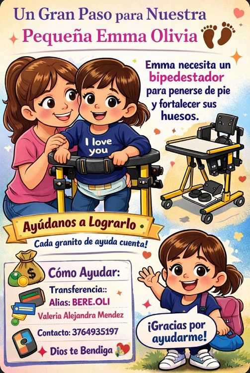 Por tal motivo, su madre, Valeria Méndez decidió dar a conocer esto que le está pasando a Emma y apelar a la solidaridad de la gente, puesto que lleva adelante una campaña solidaria para poder comprar un bipedestador (es un equipo médico ortopédico diseñado para sostener a personas con movilidad reducida en posición vertical, permitiéndoles ponerse de pie de forma segura y estable).