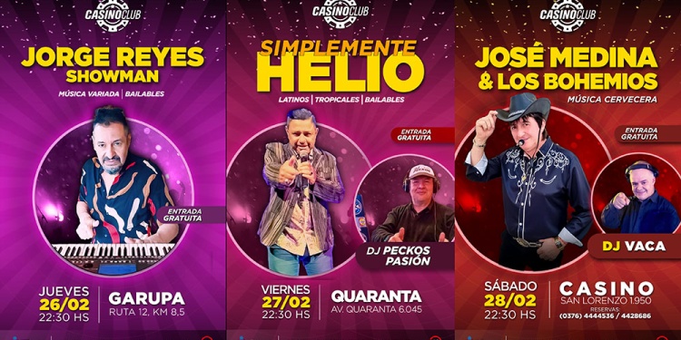 El último fin de semana de febrero llega con una propuesta cargada de música en vivo, animación y pista bailable en las distintas sedes de Casino Club. Con entrada gratuita y espectáculos para todos los gustos, la agenda combina ritmos tropicales, melódicos, cerveceros y clásicos populares.