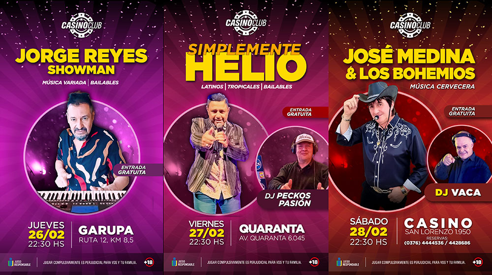 El último fin de semana de febrero llega con una propuesta cargada de música en vivo, animación y pista bailable en las distintas sedes de Casino Club. Con entrada gratuita y espectáculos para todos los gustos, la agenda combina ritmos tropicales, melódicos, cerveceros y clásicos populares.