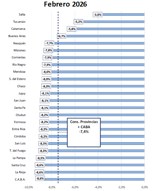 La contracción no es un fenómeno aislado. Todas las jurisdicciones registraron variaciones negativas en febrero. En el consolidado de provincias y CABA, las transferencias automáticas cayeron 7,4% real interanual en el segundo mes del año, mientras que la coparticipación pura -sin leyes especiales ni compensaciones- descendió 8,8% en términos reales.