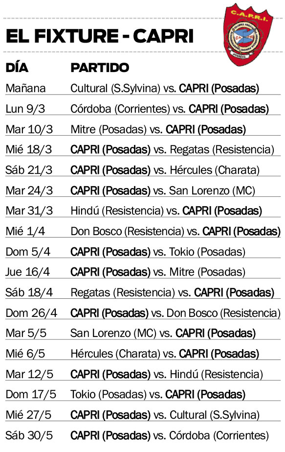 Por otra parte, vale decir que CAPRI tendrá una primera fase con mayoría de partidos como visitante. Para el entrenador, “es una desventaja”, aunque mientras acompañen los resultados “puede transformarse en ventaja”, dijo.