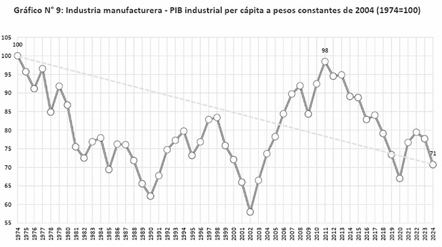 • Retroceso de 40 años en el PBI industrial per cápita. Actualmente el nivel es similar al de 1985.