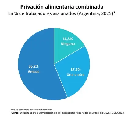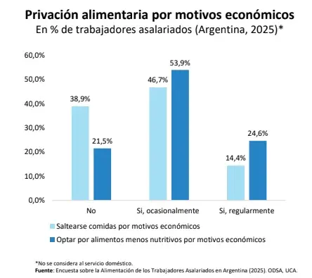Un informe del Observatorio de la Deuda Social de la Universidad Católica Argentina (UCA) encendió una señal de alerta sobre la situación alimentaria de los trabajadores en el país. El estudio revela que más de ocho de cada diez asalariados enfrentan algún grado de inseguridad alimentaria, una problemática que se vincula con la pérdida de poder adquisitivo y el aumento sostenido de los precios de los alimentos.