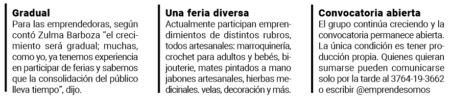 Actualmente participan emprendimientos de distintos rubros, todos artesanales: marroquinería, crochet para adultos y bebés, bijouterie, mates pintados a mano jabones artesanales, hierbas medicinales. velas 3D, resina artística, decoración para el hogar, confección de ropa para mujeres y bebés, accesorios para mascotas, macetas y porta macetas, productos regionales y sublimaciones. “Estamos construyendo un espacio que reconozca el trabajo artesanal, donde cada producto tenga detrás una historia”, finalizó.