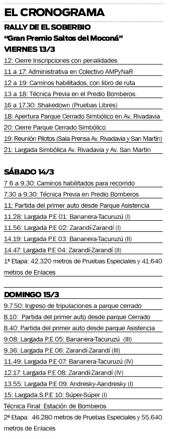 La primera fecha del Campeonato Misionero de Rally, que se disputará desde este viernes al domingo por los caminos vecinales de El Soberbio, ya conoce sus horarios y a los 37 binomios que serán parte de la prueba.
