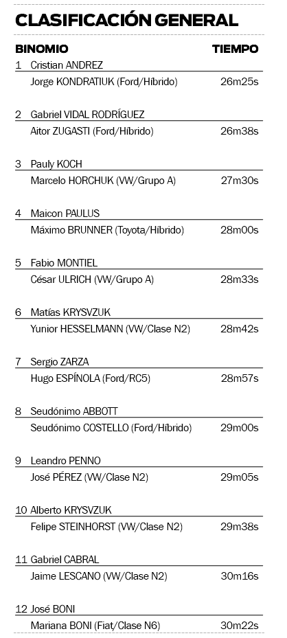 En la tercera posición de la general aparece el experimentado Pauly Koch (Volkswagen), acompañado por Marcelo Horchuk, quien domina en el Grupo A, categoría en la que justamente buscará revalidar el título obtenido el año pasado.