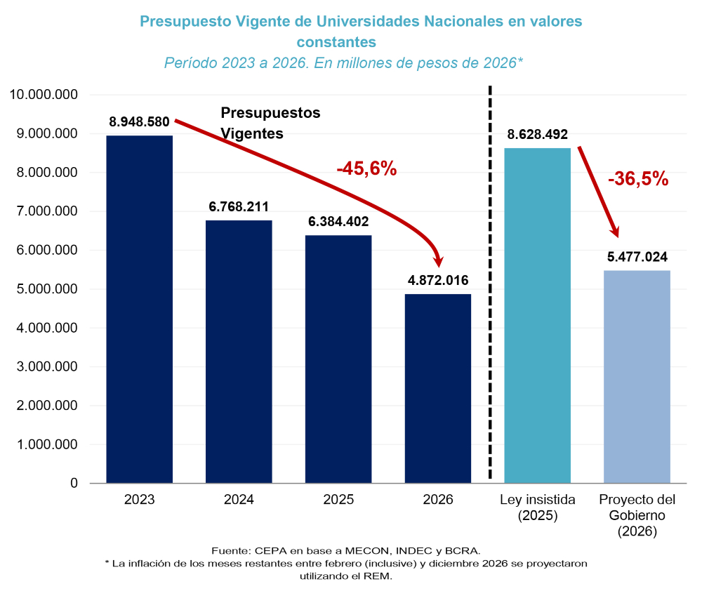 Más allá del debate legal, los números del financiamiento universitario permiten dimensionar el alcance del problema. Según el informe del CEPA, entre 2023 y 2025 el presupuesto destinado a las universidades nacionales sufrió una caída real del 28,7%. Si se considera el presupuesto proyectado para 2026, la reducción acumulada respecto de 2023 alcanza el 45,6%.