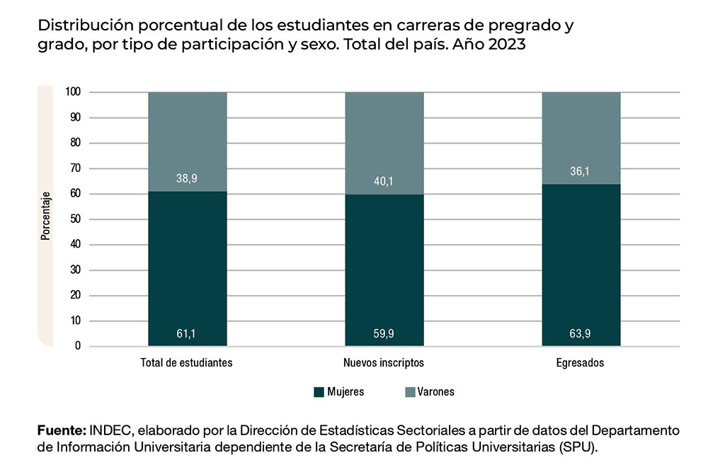 En detalle, los números del INDEC muestran que las mujeres representan el 64% de los nuevos profesionales a nivel nacional, mientras que los varones alcanzan el 36% de los títulos. En las aulas, la presencia femenina también es mayor: del total nacional de estudiantes, el 61% son mujeres, mientras que en las nuevas inscripciones ocupan el 59%.