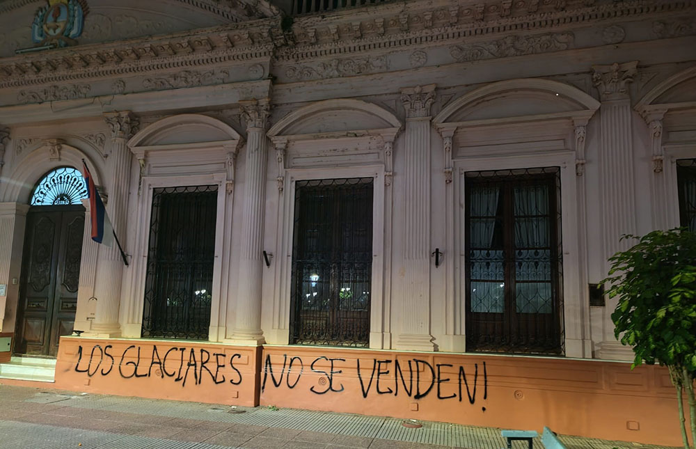 La consigna pintada hace referencia a la Ley Nacional de Glaciares (Ley 26.639), sancionada en 2010, que establece la protección de los glaciares y del ambiente periglacial como reservas estratégicas de agua dulce cuya reforma fue aprobada por el  Senado el 26 de febrero pasado.