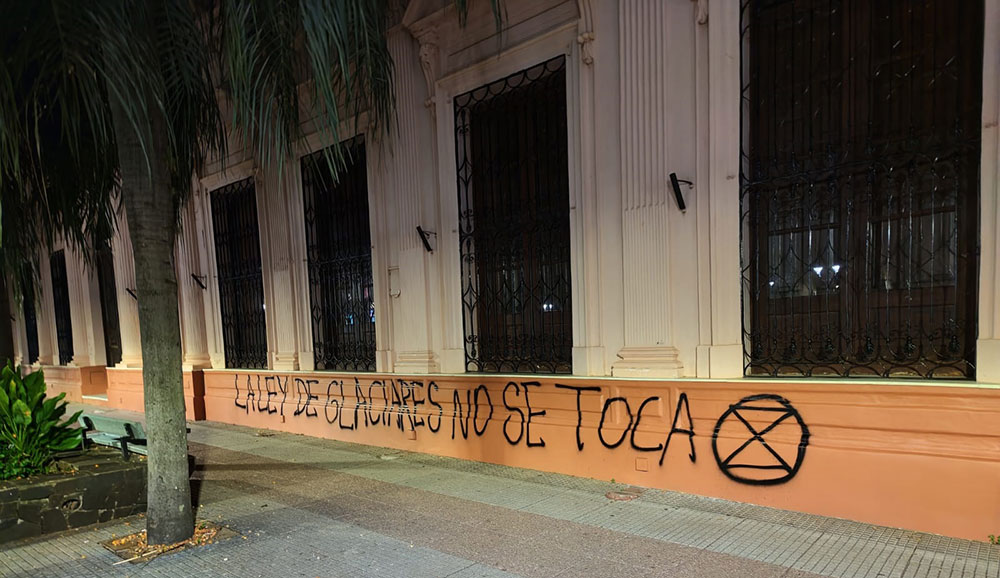 La consigna pintada hace referencia a la Ley Nacional de Glaciares (Ley 26.639), sancionada en 2010, que establece la protección de los glaciares y del ambiente periglacial como reservas estratégicas de agua dulce cuya reforma fue aprobada por el  Senado el 26 de febrero pasado.
