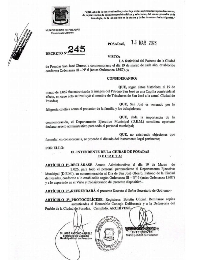 La ciudad de Posadas tendrá asueto administrativo, bancario y educativo este jueves 19 de marzo con motivo de la celebración de su Santo Patrono, San José. Desde la comuna capitalina la medida fue oficializada mediante el Decreto 245, firmado el 13 de marzo de 2026 por el Departamento Ejecutivo Municipal.