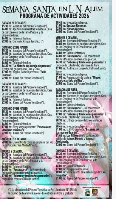 En lo inmediato, la agenda se pondrá en marcha con las actividades de Semana Santa, que incluirán la apertura del parque temático y una serie de espectáculos artísticos y propuestas religiosas. Sebely detalló que el programa contempla presentaciones destacadas. “Vamos a tener a Marcos Álvarez, el viernes a Luis Marinoni con un espectáculo de más de doscientas personas en escena, y el sábado a Los Núñez con Nahuel Pennisi”, indicó.